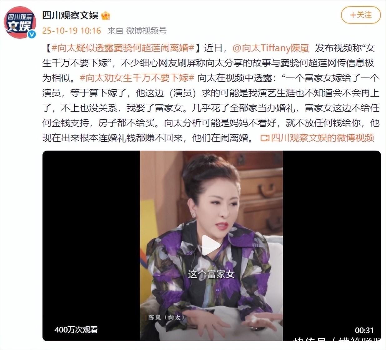 向太一句“富家女下嫁演员,婚礼费用全由男方承担,如今连本金都没收回”的言论,瞬间点燃了沉寂已久的舆论场。